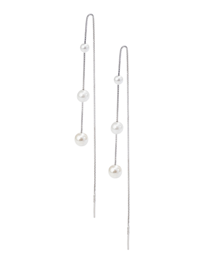 Die Maren Fädelohrringe sind moderne Brautohrringe mit drei wunderschönen Perlen an einer 925er Sterling Silber Boxkette mit Rhodiumbeschichtung. Durch das Design der Fädler können die Ohrringe durch mehrere Piercings getragen werden, was für einen einzigartigen Look sorgt.