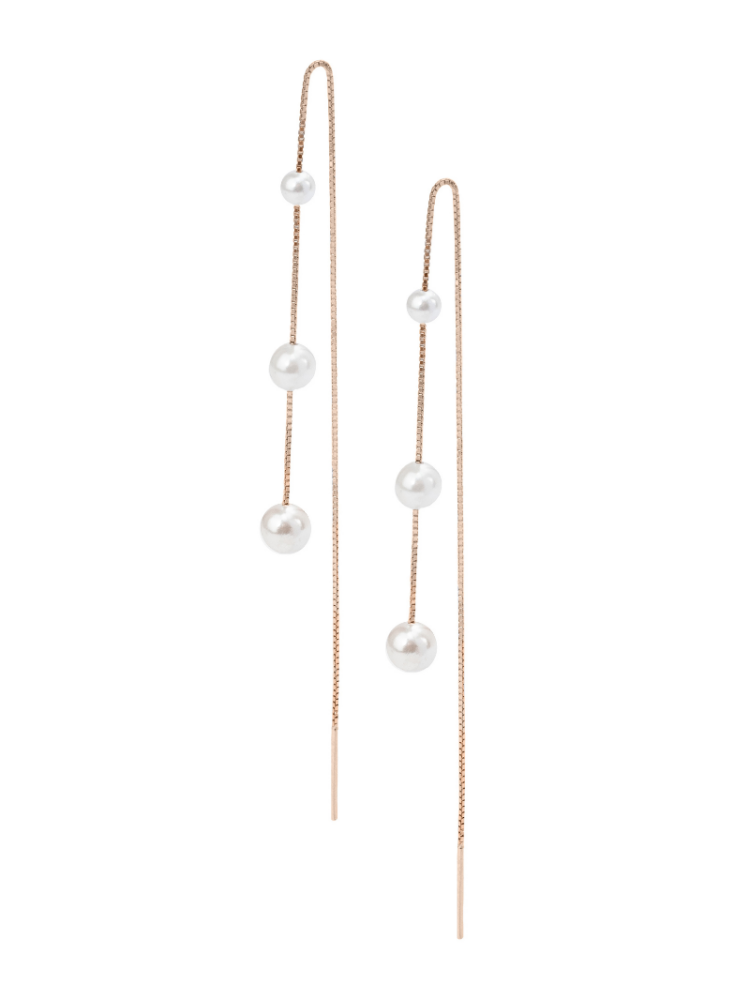 Die Maren Fädelohrringe sind moderne Brautohrringe mit drei wunderschönen Perlen an einer 925er Sterling Silber Boxkette mit Roségoldplattierung. Durch das Design der Fädler können die Ohrringe durch mehrere Piercings getragen werden, was für einen einzigartigen Look sorgt.