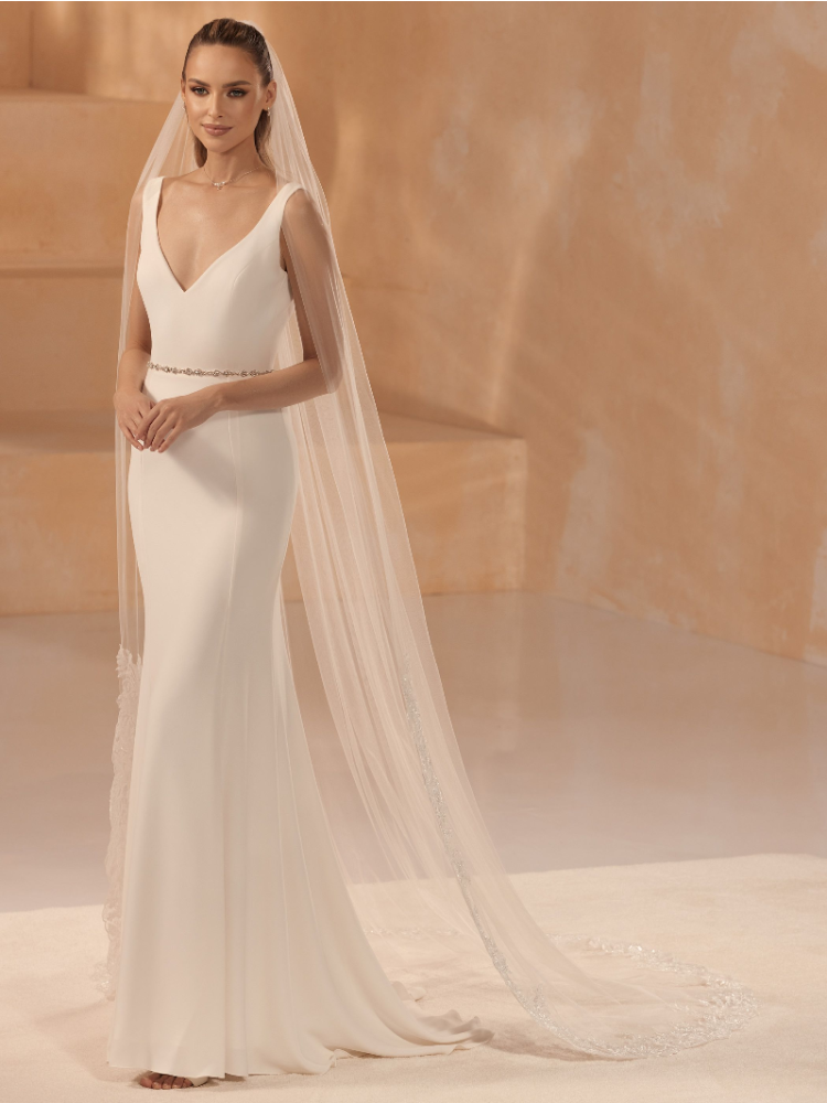 Dieser elegante Schleier von Bianco Evento wird Ihren Brautlook vervollständigen. Dieser einlagige Schleier besteht aus weichem Tüll mit einer geschnittenen Kante am oberen Ende und einer Spitzenkante am unteren Ende. Am Schleier ist ein Kamm befestigt, mit dem Sie den Schleier leicht ins Haar stecken können.