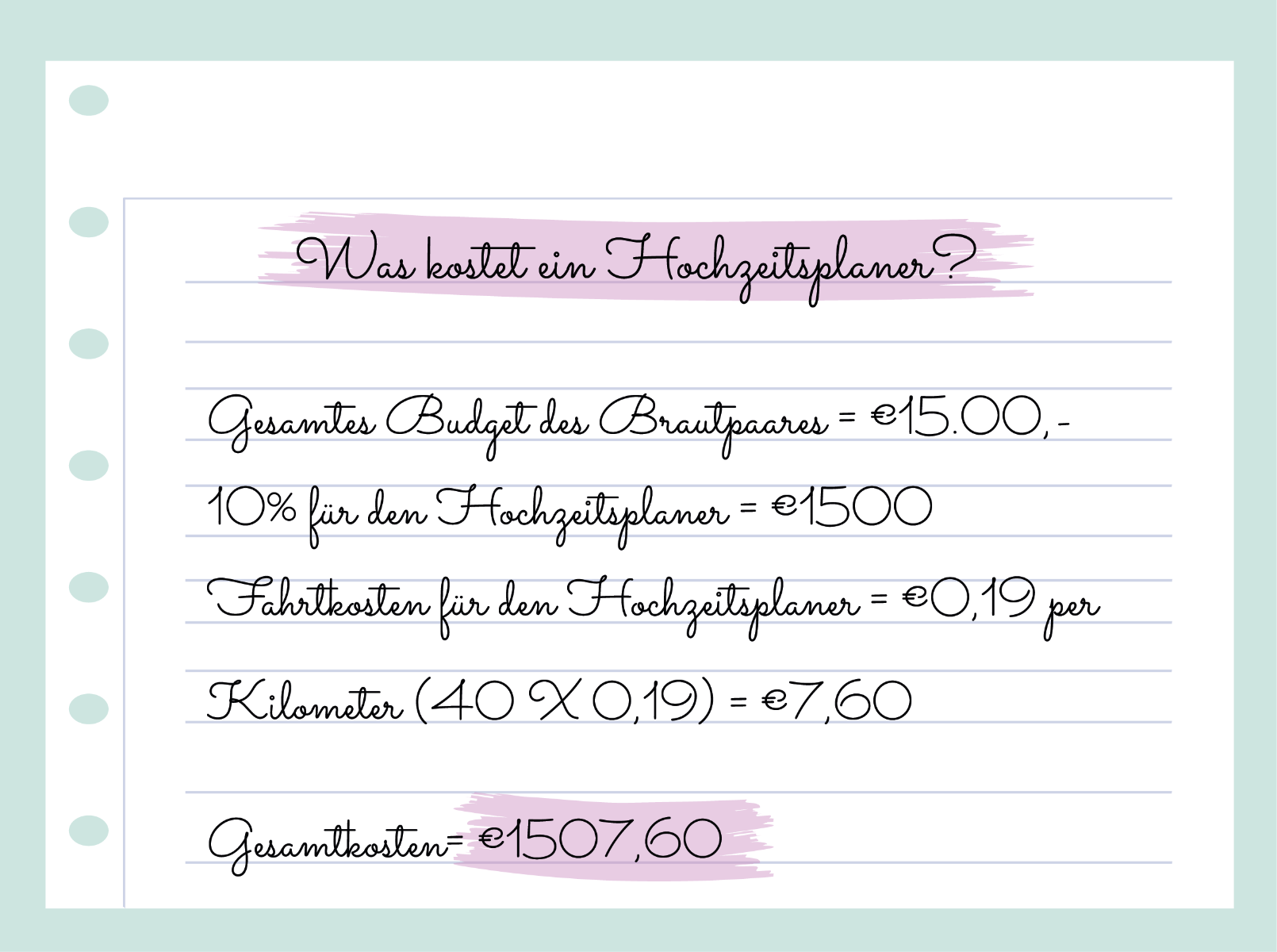 - Fallen zusätzliche Kosten an? Einige Hochzeitsplaner berechnen zusätzliche Kosten für Anreise und/oder Parken.