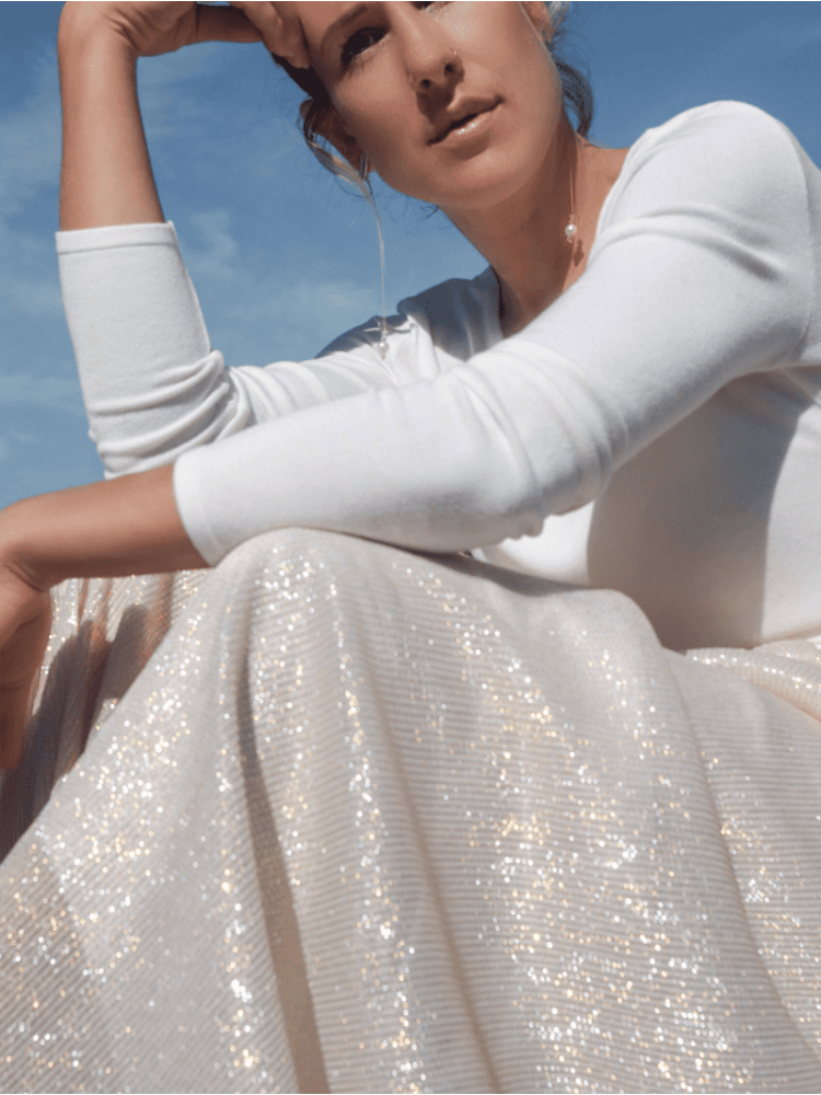 Dieser wunderschöne Rock R5634 ist ein glänzender Faltenrock für die Braut. Dieser schöne Rock ist aus fließendem, plissiertem elfenbeinfarbenem Strickstoff gefertigt, der mit goldenen und silbernen Lurexfäden durchsetzt ist. Er hat ein elastisches Futter und einen bequemen Gummizug am Bund. Der Rock ist am Saum gesäumt, so dass die Länge leicht verkürzt werden kann.