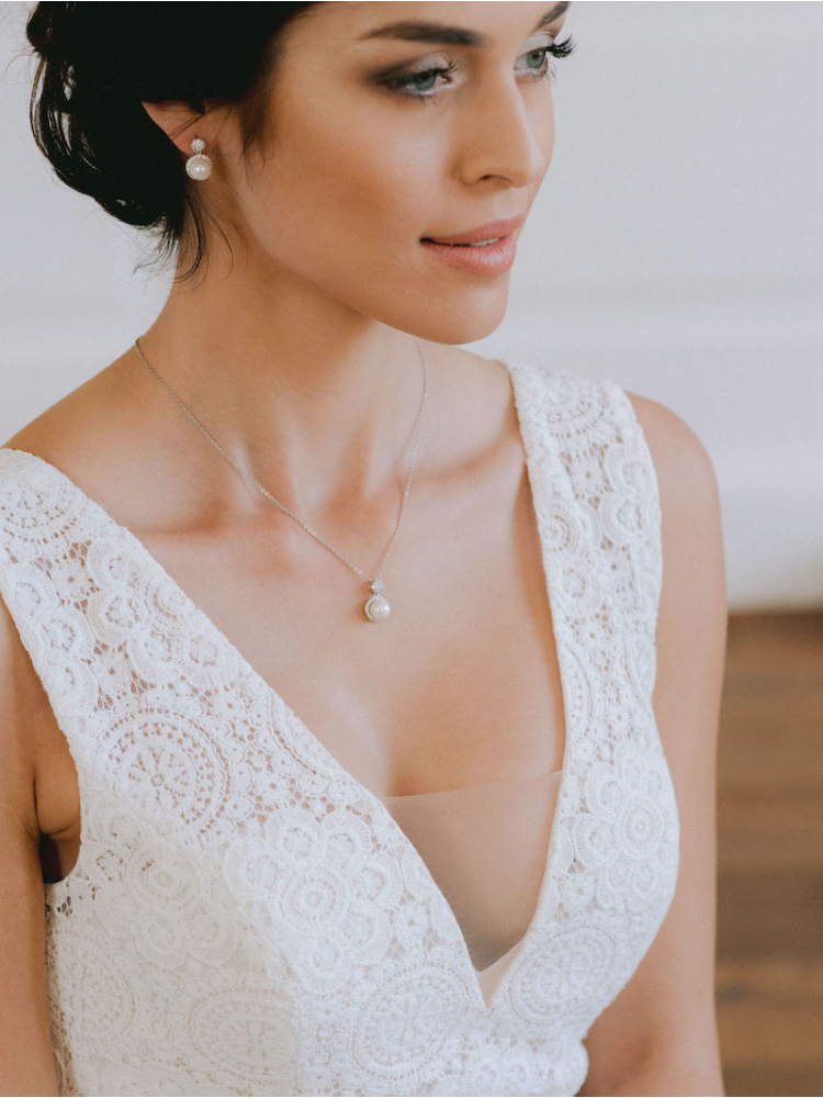 Sind Sie auf der Suche nach Schmuck, der sowohl zu Ihrem Brautkleid als auch zusammen passt? Dann schauen Sie sich unsere Schmucksets an! Wenn Sie sich für ein Schmuckset entscheiden, sparen Sie die Zeit, die Sie mit der Suche nach passenden Schmuckstücken verbringen. Das Schmuckset DZ0147 besteht aus Ohrringen und einer Halskette und ist sehr elegant. Wegen der Einfachheit dieses Sets passt jedes Brautkleid!