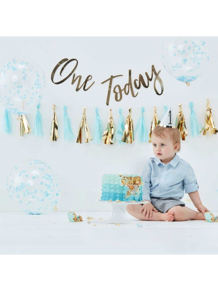 Inhalt: 1x One Today Pendel, 1x Partyhut, 16 Quasten und 5x Konfettiballons.