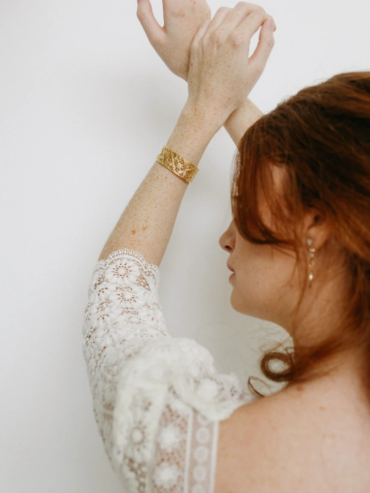 Das osmanische Armband von Lizeron ist ein vergoldetes Messingstück mit einem kunstvoll gestalteten französischen Muster. Es ist elegant und zeitlos. Es verleiht jedem Outfit Charakter.