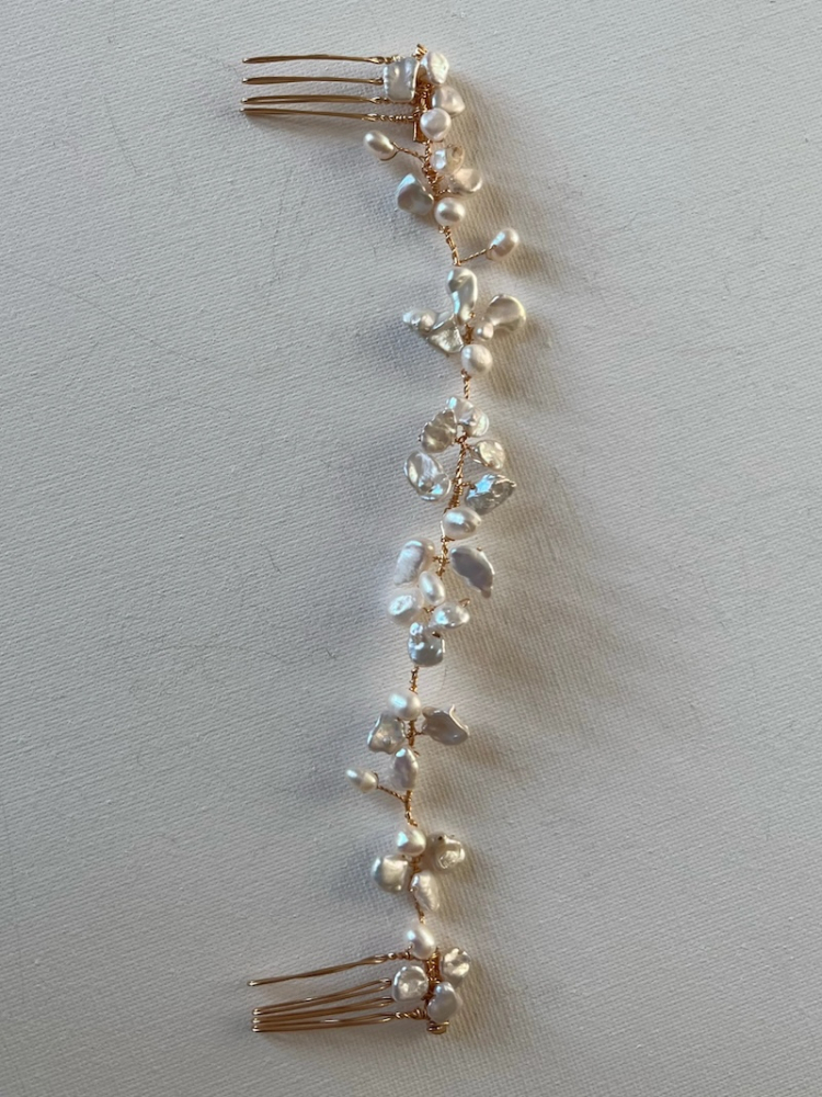 Nova Haarstrang Gold von Sally Jane Bridal ist ein wunderschönes, handgefertigtes, flexibles Haaraccessoire, das jeder Brautfrisur eine sanfte, natürliche Eleganz verleiht. Mit einzigartigen unregelmäßigen Perlen und schimmernden Süßwasserperlen auf einem feinen goldfarbenen Draht schafft diese 18 cm lange Haarstrang einen romantischen, organischen Look. Das leichte, biegsame Design macht es einfach, in Zöpfe zu integrieren, um eine niedrige Dutt zu wickeln oder in eine halb-hochfrisur zu stylen. Perfekt für Bräute, die einen minimalistischen, Boho- oder romantischen Akzent suchen.