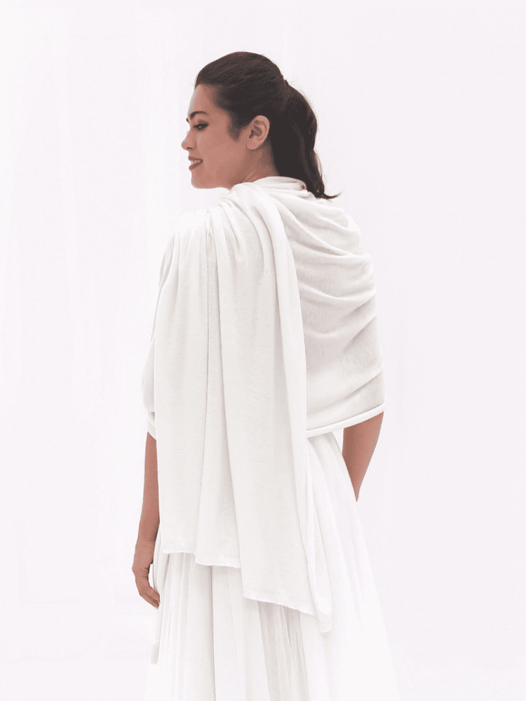 Die elfenbeinfarbene Stola S189 ist genau das, wonach Sie suchen! Diese Stola ist aus einem Verbundstoff gefertigt, der aus 16% Wolle, 20% Acryl, 20% Nylon und 44% Polyester besteht. Die Maße dieser Stola sind 240 cm x 80 cm (94,4 x 31,5 inch). Die neutrale Farbe und das Design machen diesen Schal zum ultimativen Hochzeits-Accessoire.