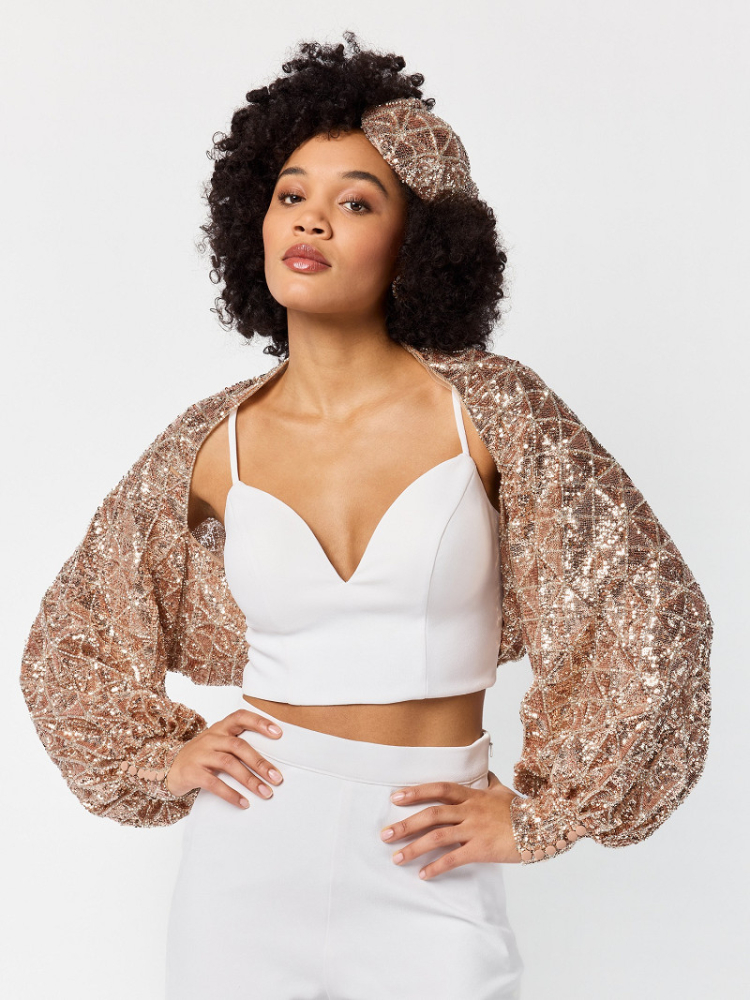 Make a stunning statement with this sophisticated bronze stole from the Poirier collection. Crafted from delicate tulle, this eye-catching piece features intricate sequin and bead embellishments arranged in a striking triangle design. The stole includes long sleeves for added elegance, making it the perfect blend of fashion and function.