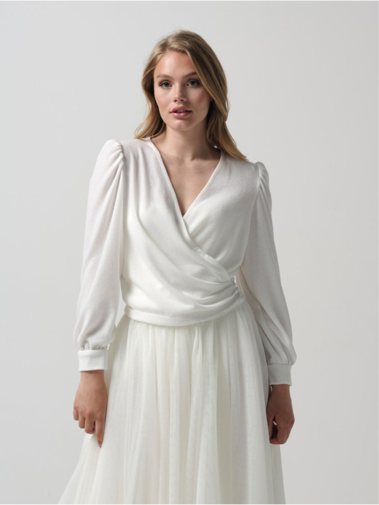 Elegantes Top mit V-Ausschnitt aus der Essential Collection von Poirier. Dieses Oberteil wird an der Seite gebunden und hat lange Ärmel. Kombinieren Sie dieses Oberteil mit allen Brautröcken von Poirier.